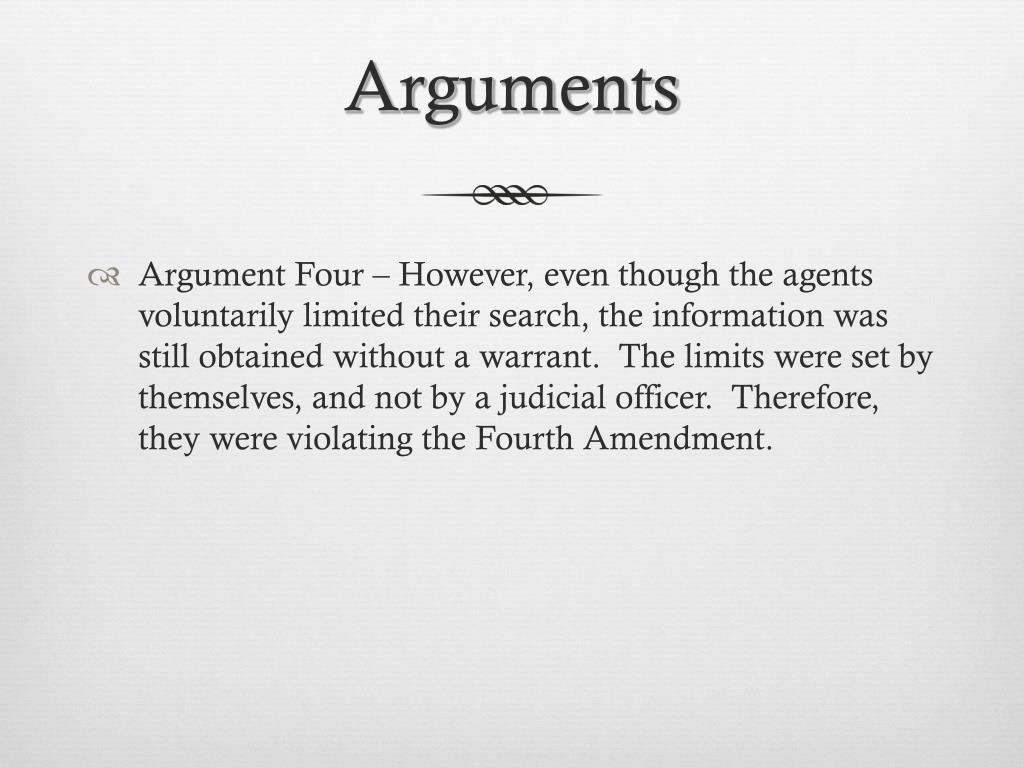 Arguments Argument Four – However, even though the agents voluntarily limited their search, the information was still obtained without a warrant. The limits were set by themselves, and not by a judicial officer. Therefore, they were violating the Fourth Amendment.