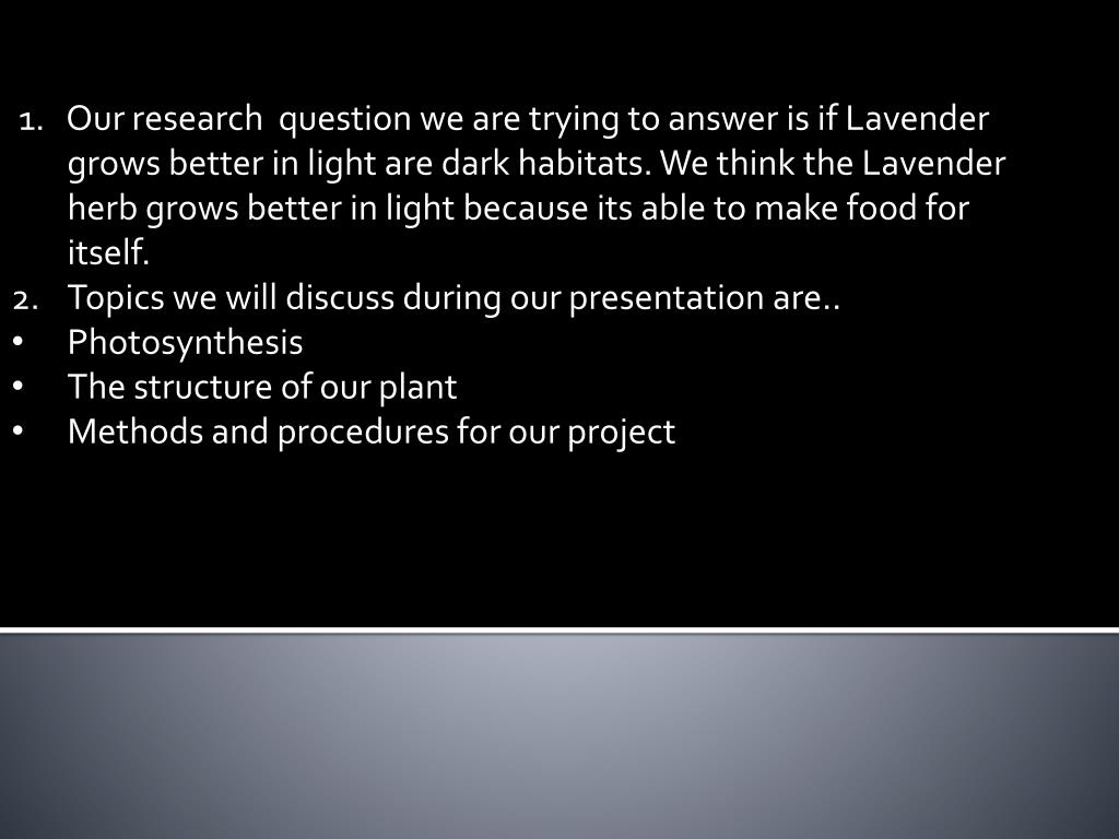 1. Our research question we are trying to answer is if Lavender grows better in light are dark habitats. We think the Lavender herb grows better in light because its able to make food for itself. • 2. Topics we will discuss during our presentation are.. • Photosynthesis • The structure of our plant • Methods and procedures for our project