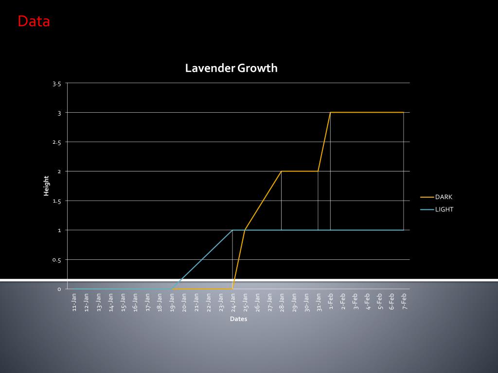 This presentation explores whether lavender (Lavandula angustifolia) grows better in light or dark habitats. Our hypothesis posits that lavender thrives in light due to its ability to perform photosynthesis, which occurs in chloroplasts within plant cells. We will discuss the structure of lavender, the significance of photosynthesis, and the methodology of our experiment. Background information highlights the plant's evolution, adaptations, and its various uses. We also examine factors affecting plant growth, including water, carbon dioxide, and sunlight.