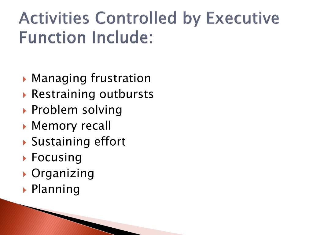 Activities Controlled by Executive Function Include: • Managing frustration • Restraining outbursts • Problem solving • Memory recall • Sustaining effort • Focusing • Organizing • Planning