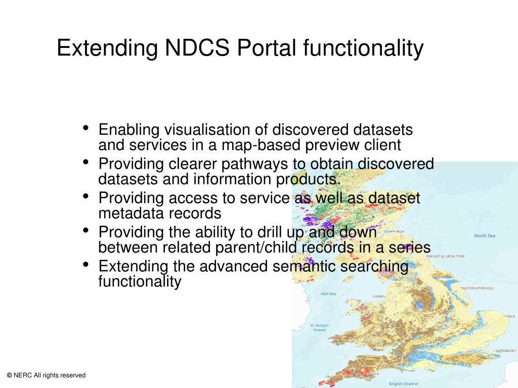 Extending NDCS Portal functionality Enabling visualisation of discovered datasets and services in a map-based preview client Providing clearer pathways to obtain discovered datasets and information products. Providing access to service as well as dataset metadata records Providing the ability to drill up and down between related parent/child records in a series Extending the advanced semantic searching functionality