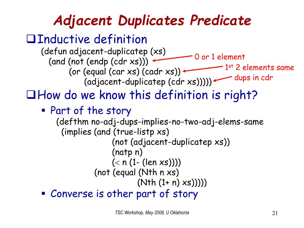 0 or 1 element 1st 2 elements same dups in cdr Adjacent Duplicates Predicate • Inductive definition (defun adjacent-duplicatep (xs) (and (not (endp (cdr xs))) (or (equal (car xs) (cadr xs)) (adjacent-duplicatep (cdr xs))))) • How do we know this definition is right? • Part of the story (defthm no-adj-dups-implies-no-two-adj-elems-same (implies (and (true-listp xs) (not (adjacent-duplicatep xs)) (natp n) (< n (1- (len xs)))) (not (equal (Nth n xs) (Nth (1+ n) xs))))) • Converse is other part of story TSC Workshop, May 2008, U Oklahoma