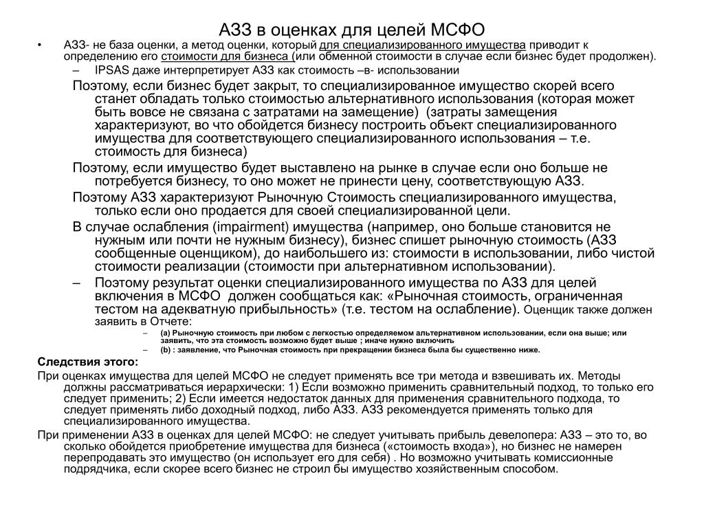 АЗЗ в оценках для целей МСФО • АЗЗ- не база оценки, а метод оценки, который для специализированного имущества приводит к определению его стоимости для бизнеса (или обменной стоимости в случае если бизнес будет продолжен). • IPSAS даже интерпретирует АЗЗ как стоимость –в- использовании Поэтому, если бизнес будет закрыт, то специализированное имущество скорей всего станет обладать только стоимостью альтернативного использования (которая может быть вовсе не связана с затратами на замещение) (затраты замещения характеризуют, во что обойдется бизнесу построить объект специализированного имущества для соответствующего специализированного использования – т.е. стоимость для бизнеса) Поэтому, если имущество будет выставлено на рынке в случае если оно больше не потребуется бизнесу, то оно может не принести цену, соответствующую АЗЗ. Поэтому АЗЗ характеризуют Рыночную Стоимость специализированного имущества, только если оно продается для своей специализированной цели. В случае ослабления (impairment) имущества (например, оно больше становится не нужным или почти не нужным бизнесу), бизнес спишет рыночную стоимость (АЗЗ сообщенные оценщиком), до наибольшего из: стоимости в использовании, либо чистой стоимости реализации (стоимости при альтернативном использовании). • Поэтому результат оценки специализированного имущества по АЗЗ для целей включения в МСФО должен сообщаться как: «Рыночная стоимость, ограниченная тестом на адекватную прибыльность» (т.е. тестом на ослабление). Оценщик также должен заявить в Отчете: • (a) Рыночную стоимость при любом с легкостью определяемом альтернативном использовании, если она выше; или заявить, что эта стоимость возможно будет выше ; иначе нужно включить • (b) : заявление, что Рыночная стоимость при прекращении бизнеса была бы существенно ниже. Следствия этого: При оценках имущества для целей МСФО не следует применять все три метода и взвешивать их. Методы должны рассматриваться иерархически: 1) Если возможно применить сравнительный подход, то только его следует применить; 2) Если имеется недостаток данных для применения сравнительного подхода, то следует применять либо доходный подход, либо АЗЗ. АЗЗ рекомендуется применять только для специализированного имущества. При применении АЗЗ в оценках для целей МСФО: не следует учитывать прибыль девелопера: АЗЗ – это то, во сколько обойдется приобретение имущества для бизнеса («стоимость входа»), но бизнес не намерен перепродавать это имущество (он использует его для себя) . Но возможно учитывать комиссионные подрядчика, если скорее всего бизнес не строил бы имущество хозяйственным способом.
