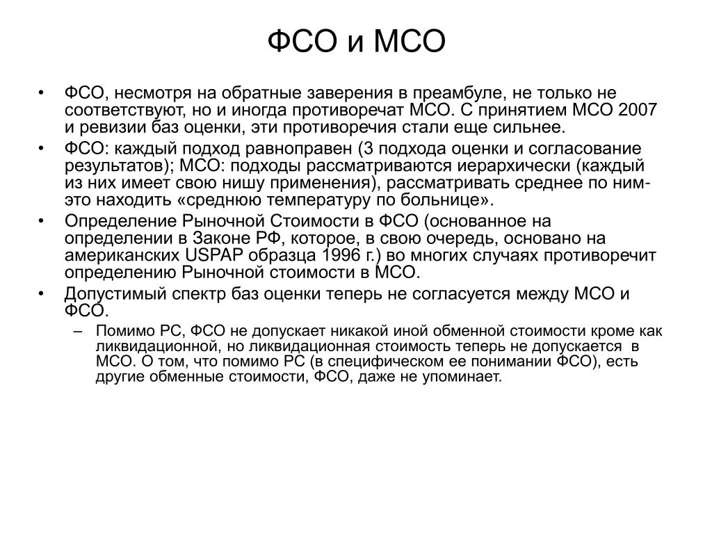 ФСО и МСО • ФСО, несмотря на обратные заверения в преамбуле, не только не соответствуют, но и иногда противоречат МСО. С принятием МСО 2007 и ревизии баз оценки, эти противоречия стали еще сильнее. • ФСО: каждый подход равноправен (3 подхода оценки и согласование результатов); МСО:подходы рассматриваются иерархически (каждый из них имеет свою нишу применения), рассматривать среднее по ним- это находить «среднюю температуру по больнице». • Определение Рыночной Стоимости в ФСО (основанное на определении в Законе РФ, которое, в свою очередь, основано на американских USPAP образца 1996 г.) во многих случаях противоречит определению Рыночной стоимости в МСО. • Допустимый спектр баз оценки теперь не согласуется между МСО и ФСО. • Помимо РС, ФСО не допускает никакой иной обменной стоимости кроме как ликвидационной, но ликвидационная стоимость теперь не допускается в МСО. О том, что помимо РС (в специфическом ее понимании ФСО), есть другие обменные стоимости, ФСО, даже не упоминает.