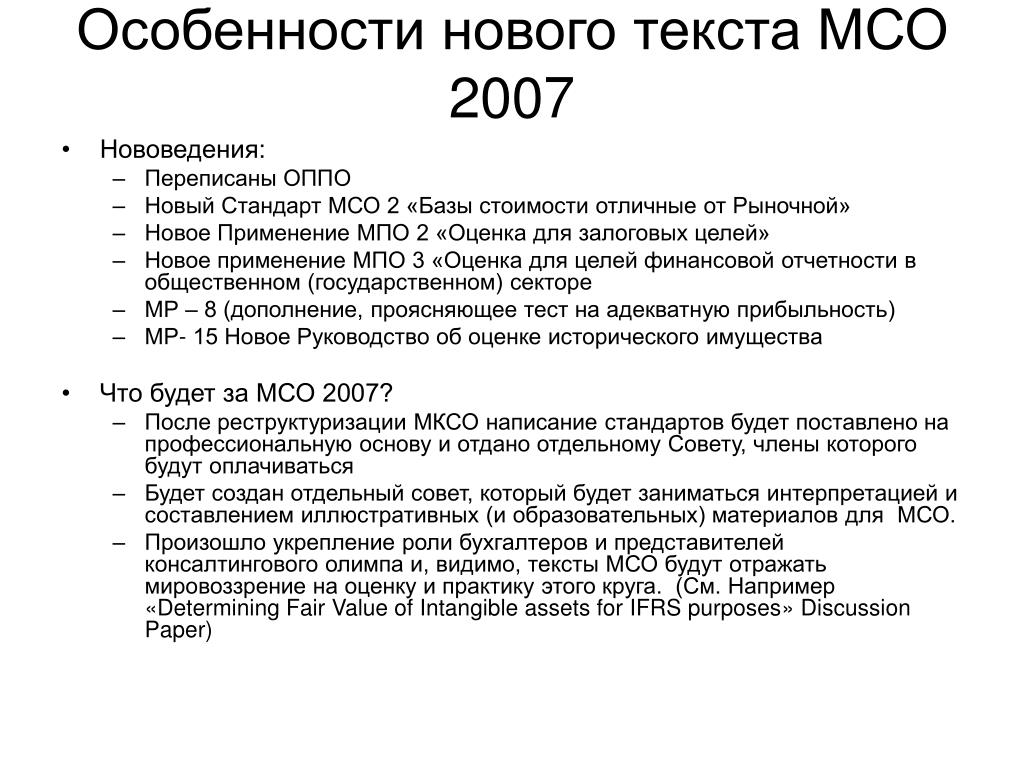 Особенности нового текста МСО 2007 • Нововедения: • Переписаны ОППО • Новый Стандарт МСО 2 «Базы стоимости отличные от Рыночной» • Новое Применение МПО 2 «Оценка для залоговых целей» • Новое применение МПО 3 «Оценка для целей финансовой отчетности в общественном (государственном) секторе • МР – 8 (дополнение, проясняющее тест на адекватную прибыльность) • МР- 15 Новое Руководство об оценке исторического имущества • Что будет за МСО 2007? • После реструктуризации МКСО написание стандартов будет поставлено на профессиональную основу и отдано отдельному Совету, члены которого будут оплачиваться • Будет создан отдельный совет, который будет заниматься интерпретацией и составлением иллюстративных (и образовательных) материалов для МСО. • Произошло укрепление роли бухгалтеров и представителей консалтингового олимпа и, видимо, тексты МСО будут отражать мировоззрение на оценку и практику этого круга. (См. Например «Determining Fair Value of Intangible assets for IFRS purposes» Discussion Paper)
