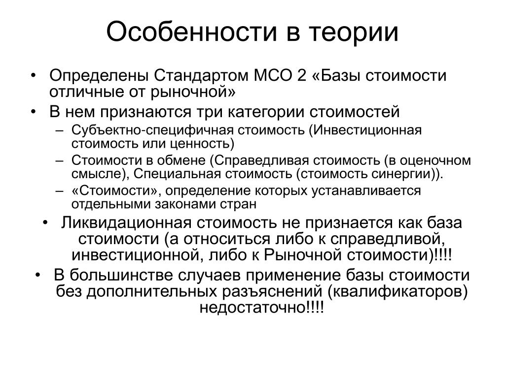 Особенности в теории • Определены Стандартом МСО 2 «Базы стоимости отличные от рыночной» • В нем признаются три категории стоимостей • Субъектно-специфичная стоимость (Инвестиционная стоимость или ценность) • Стоимости в обмене (Справедливая стоимость (в оценочном смысле), Специальная стоимость (стоимость синергии)). • «Стоимости», определение которых устанавливается отдельными законами стран • Ликвидационная стоимость не признается как база стоимости (а относиться либо к справедливой, инвестиционной, либо к Рыночной стоимости)!!!! • В большинстве случаев применение базы стоимости без дополнительных разъяснений (квалификаторов) недостаточно!!!!