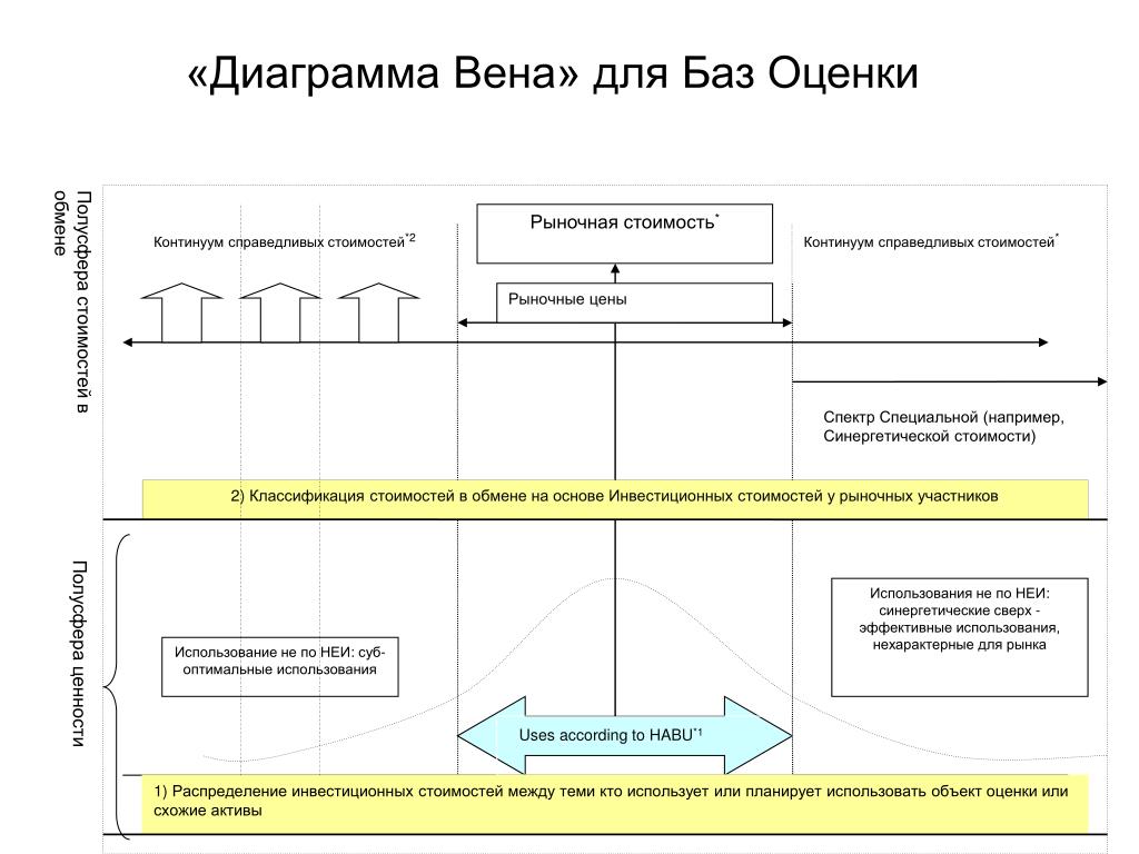 Рыночная стоимость* Континуум справедливых стоимостей*2 Континуум справедливых стоимостей* Рыночные цены Спектр Специальной (например, Синергетической стоимости) 2) Классификация стоимостей в обмене на основе Инвестиционных стоимостей у рыночных участников Использования не по НЕИ: синергетические сверх -эффективные использования, нехарактерные для рынка Использование не по НЕИ: суб- оптимальные использования Uses according to HABU*1 1) Распределение инвестиционных стоимостей между теми кто использует или планирует использовать объект оценки или схожие активы «Диаграмма Вена» для Баз Оценки Полусфера стоимостей в обмене Полусфера ценности
