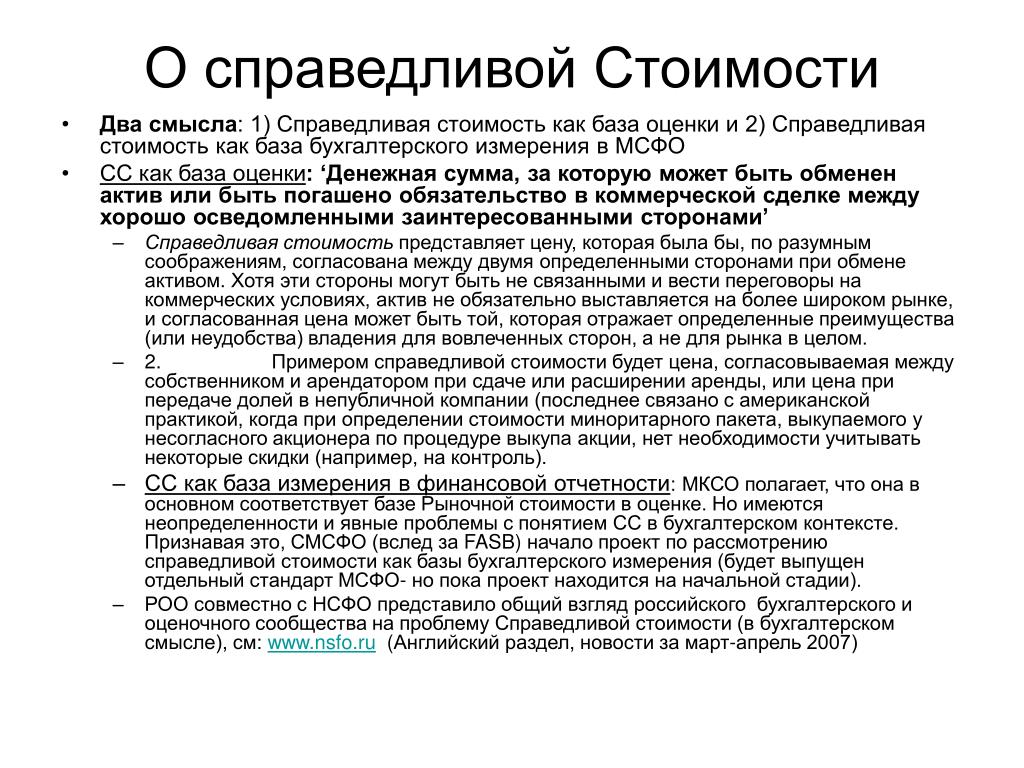 О справедливой Стоимости • Два смысла: 1) Справедливая стоимость как база оценки и 2) Справедливая стоимость как база бухгалтерского измерения в МСФО • СС как база оценки: ‘Денежная сумма, за которую может быть обменен актив или быть погашено обязательство в коммерческой сделке между хорошо осведомленными заинтересованными сторонами’ • Справедливая стоимость представляет цену, которая была бы, по разумным соображениям, согласована между двумя определенными сторонами при обмене активом. Хотя эти стороны могут быть не связанными и вести переговоры на коммерческих условиях, актив не обязательно выставляется на более широком рынке, и согласованная цена может быть той, которая отражает определенные преимущества (или неудобства) владения для вовлеченных сторон, а не для рынка в целом. • 2. Примером справедливой стоимости будет цена, согласовываемая между собственником и арендатором при сдаче или расширении аренды, или цена при передаче долей в непубличной компании (последнее связано с американской практикой, когда при определении стоимости миноритарного пакета, выкупаемого у несогласного акционера по процедуре выкупа акции, нет необходимости учитывать некоторые скидки (например, на контроль). • СС как база измерения в финансовой отчетности: МКСО полагает, что она в основном соответствует базе Рыночной стоимости в оценке. Но имеются неопределенности и явные проблемы с понятием СС в бухгалтерском контексте. Признавая это, СМСФО (вслед за FASB) начало проект по рассмотрению справедливой стоимости как базы бухгалтерского измерения (будет выпущен отдельный стандарт МСФО- но пока проект находится на начальной стадии). • РОО совместно с НСФО представило общий взгляд российского бухгалтерского и оценочного сообщества на проблему Справедливой стоимости (в бухгалтерском смысле), см: www.nsfo.ru (Английский раздел, новости за март-апрель 2007)