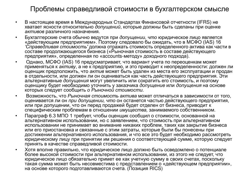 Проблемы справедливой стоимости в бухгалтерском смысле • В настоящее время в Международных Стандартах Финансовой отчетности (IFRS) не хватает ясности относительно допущений, которые должны быть сделаны при оценке активов различного назначения. • Бухгалтерские счета обычно ведутсяпри допущении, что юридическое лицо является «действующим предприятием». Поэтому следовало бы ожидать, что в МСФО (IAS) 16 ‘Справедливая стоимость' должна отражать стоимость определенного актива как части в составе продолжающегося бизнеса («Рыночная стоимость в составе действующего предприятия», определенная по «accounts-методу» доходного подхода). • Однако, МСФО (IAS) 16 предусматривает, что вариант учета по переоценкам может применяться к активу, а не к предприятию, и это приводит к неопределенности: должен ли оценщик предположить, что актив может быть удален из места его эксплуатации и продан в отдельности, или должен ли он оцениваться как часть действующего предприятия. Эти альтернативные допущения могут увеличить или сократить его стоимость, и поэтому оценщику будет необходимо уточнить у заказчика допущение или допущения на основе которых следует сообщить о Рыночной стоимости. • Возможность, что Рыночная стоимость актива может отличаться в зависимости от того, оценивается ли он при допущении, что он останется частью действующего предприятия, или при допущении, что он перед продажей будет отделен от бизнеса, приводит к специфическим проблемам в отношении имущества, занимаемого собственником. • Параграф 6.3 МПО 1 требует, чтобы оценщик сообщил о стоимости, основанной на альтернативном использовании, но с заявлением, что стоимость при альтернативном использовании не принимает во внимание никаких проблем, таких как закрытие бизнеса или его приостановка и связанные с этим затраты, которые были бы понесены при достижении альтернативного использования, и что все это будет необходимо рассмотреть юридическому лицу при принятии им решения о соответствующей сумме, которую следует принять в качестве справедливой стоимости. • Хотя вполне правильно, что юридическое лицо должно быть осведомлено о потенциале более высокой стоимости при альтернативном использовании, из этого не следует, что юридическое лицо обязательно примет ее как учетную сумму в своих счетах, поскольку такая сумма может быть несовместима с представлением о «действующем предприятии», на основе которого подготавливаются счета. (Позиция RICS)