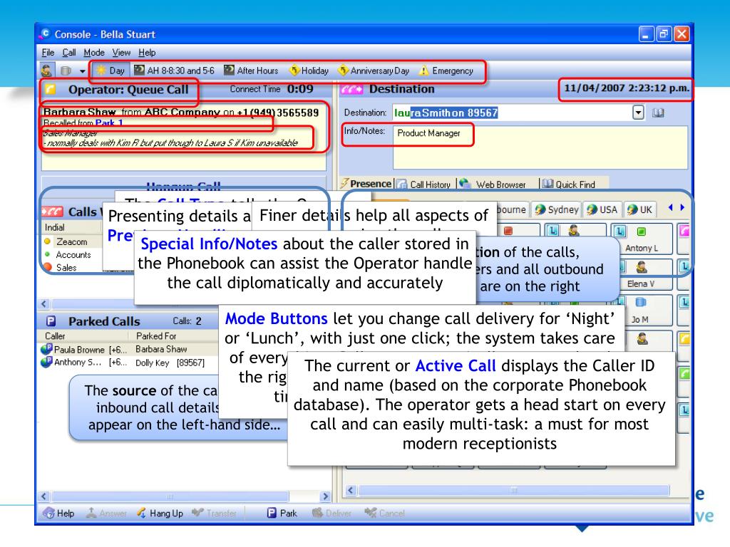 The Value of Attendant Consoles • A phone operator is the gateway between customers and the organisation • Provide operators with the tools they need to quickly and efficiently handle interactions: • Transfer to the right destination, first time, every time • High call volumes handled quickly and accurately • Consistent, professional service • Prioritise high value/urgent calls • Create exceptional customer experience and a professional impression • Increase operator productivity • Do you know which department they are in • I haven’t heard of her – does she work here • I don’t know if any one is there at he moment