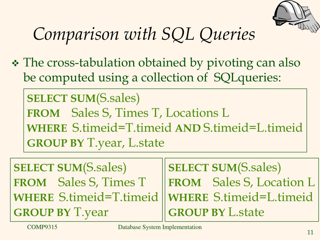 Comparison with SQL Queries • The cross-tabulation obtained by pivoting can also be computed using a collection of SQLqueries: SELECT SUM(S.sales) FROM Sales S, Times T, Locations L WHERE S.timeid=T.timeid AND S.timeid=L.timeid GROUP BY T.year, L.state SELECT SUM(S.sales) FROM Sales S, Times T WHERE S.timeid=T.timeid GROUP BY T.year SELECT SUM(S.sales) FROM Sales S, Location L WHERE S.timeid=L.timeid GROUP BY L.state Database System Implementation