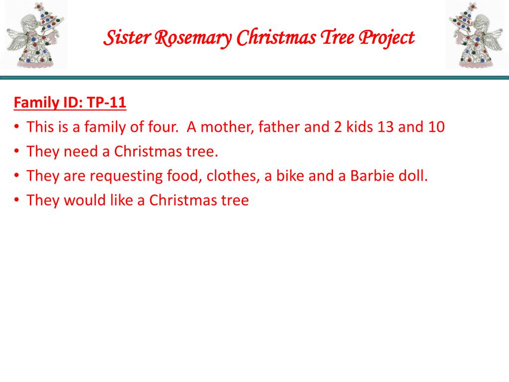 Sister Rosemary Christmas Tree Project Family ID: TP-11 This is a family of four. A mother, father and 2 kids 13 and 10 They need a Christmas tree. They are requesting food, clothes, a bike and a Barbie doll. They would like a Christmas tree