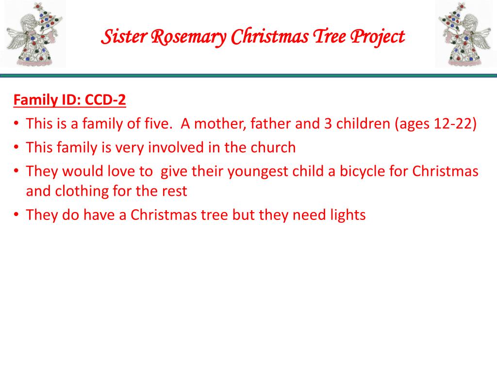 Sister Rosemary Christmas Tree Project Family ID: CCD-2 This is a family of five. A mother, father and 3 children (ages 12-22) This family is very involved in the church They would love to give their youngest child a bicycle for Christmas and clothing for the rest They do have a Christmas tree but they need lights