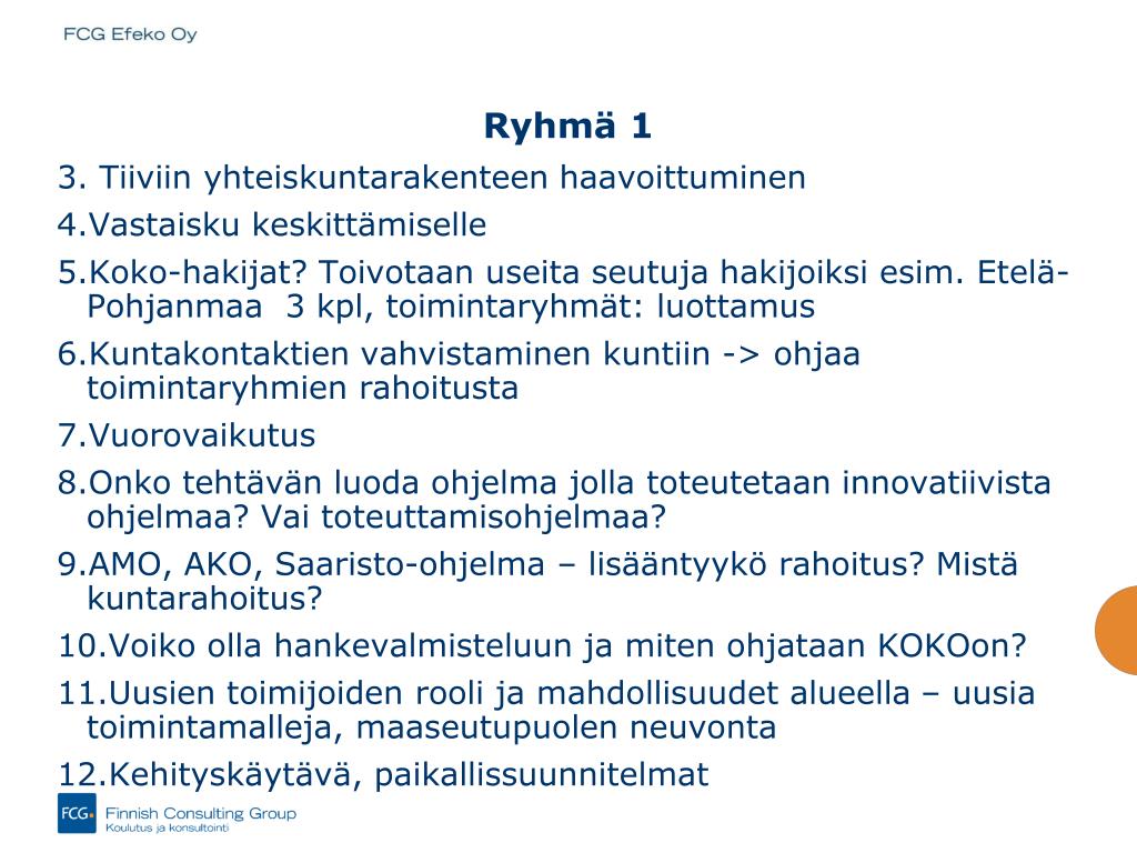Ryhmä 1 3. Tiiviin yhteiskuntarakenteen haavoittuminen • Vastaisku keskittämiselle • Koko-hakijat? Toivotaan useita seutuja hakijoiksi esim. Etelä-Pohjanmaa 3 kpl, toimintaryhmät: luottamus • Kuntakontaktien vahvistaminen kuntiin -> ohjaa toimintaryhmien rahoitusta • Vuorovaikutus • Onko tehtävän luoda ohjelma jolla toteutetaan innovatiivista ohjelmaa? Vai toteuttamisohjelmaa? • AMO, AKO, Saaristo-ohjelma – lisääntyykö rahoitus? Mistä kuntarahoitus? • Voiko olla hankevalmisteluun ja miten ohjataan KOKOon? • Uusien toimijoiden rooli ja mahdollisuudet alueella – uusia toimintamalleja, maaseutupuolen neuvonta • Kehityskäytävä, paikallissuunnitelmat