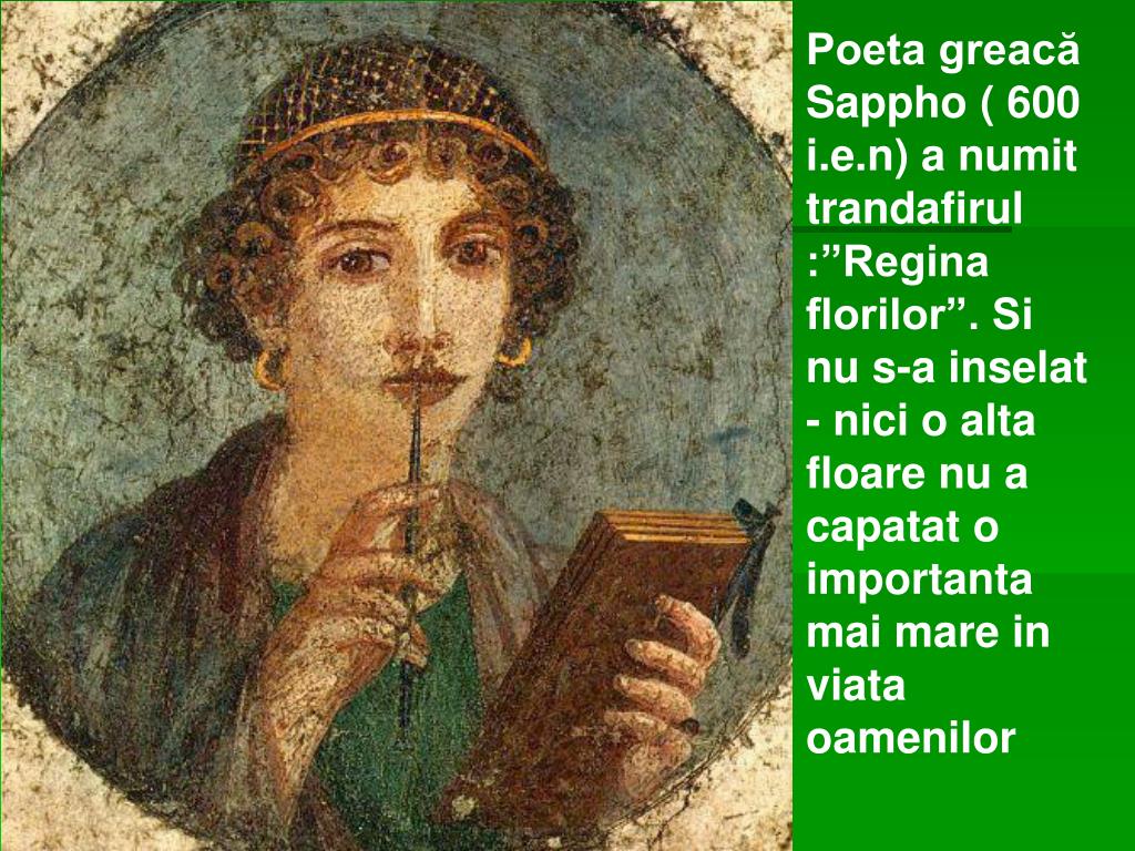 ROZA “REGINA FLORILOR”. Poeta greacă Sappho ( 600 i .e.n) a numit trandafirul :”Regina florilor”. Si nu s-a inselat - nici o alta floare nu a capatat o importanta mai mare in viata oamenilor. Ea este asociată cu Grădinile Edenului, cu cele suspendate ale Semiramidei