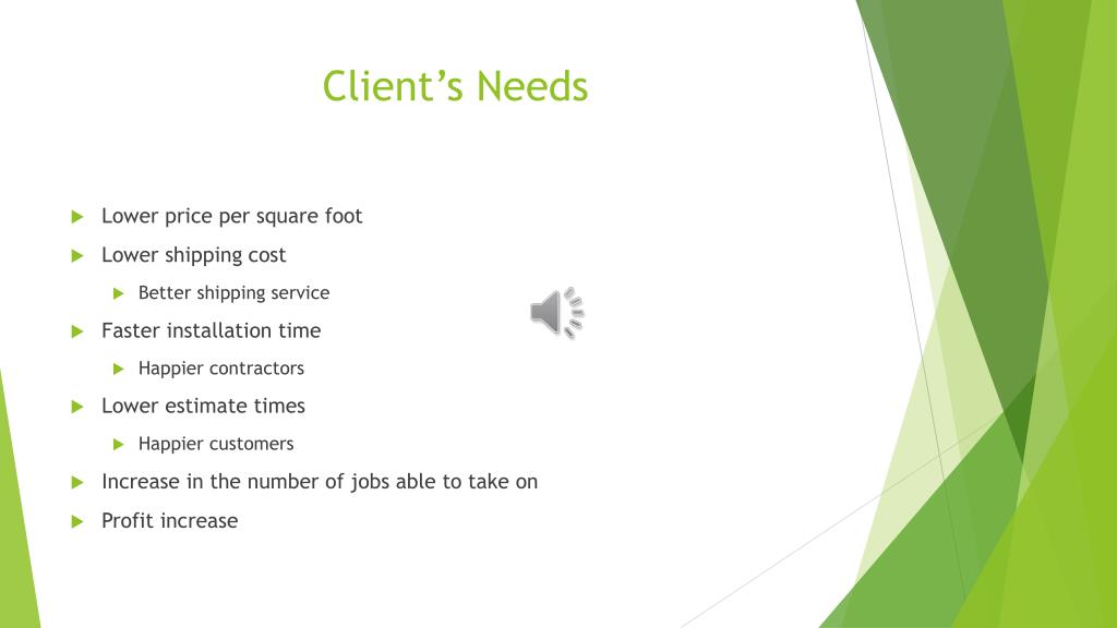Client’s Needs • Lower price per square foot • Lower shipping cost • Better shipping service • Faster installation time • Happier contractors • Lower estimate times • Happier customers • Increase in the number of jobs able to take on • Profit increase