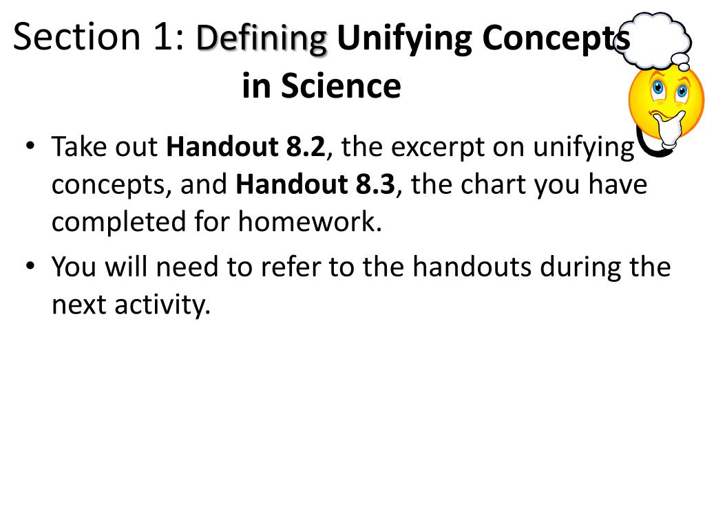 Section 1: Defining Unifying Concepts in Science • Take out Handout 8.2, the excerpt on unifying concepts, and Handout 8.3, the chart you have completed for homework. • You will need to refer to the handouts during the next activity.