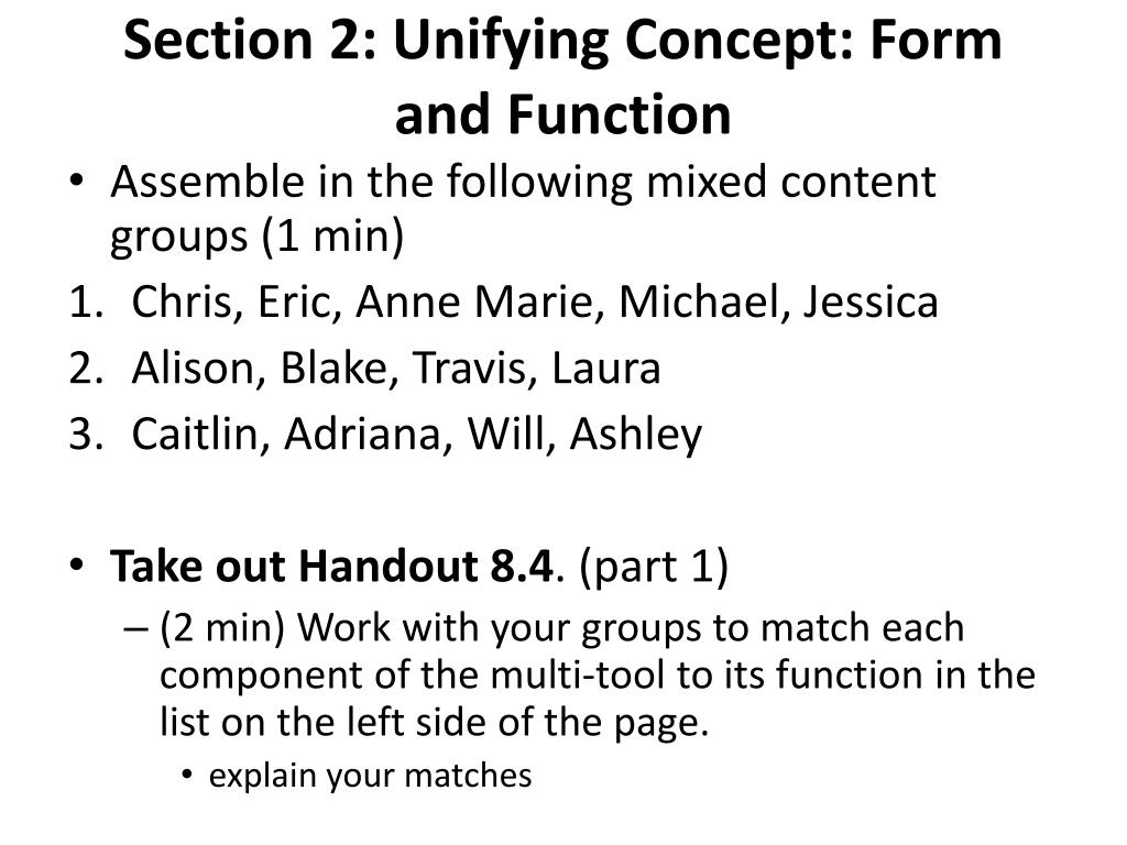 Section 2: Unifying Concept: Form and Function • Assemble in the following mixed content groups (1 min) • Chris, Eric, Anne Marie, Michael, Jessica • Alison, Blake, Travis, Laura • Caitlin, Adriana, Will, Ashley • Take out Handout 8.4. (part 1) • (2 min) Work with your groups to match each component of the multi-tool to its function in the list on the left side of the page. • explain your matches