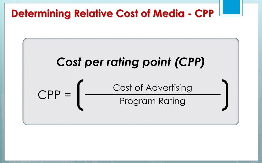Determining Relative Cost of Media - CPP Cost per rating point (CPP) Cost of Advertising CPP = Program Rating