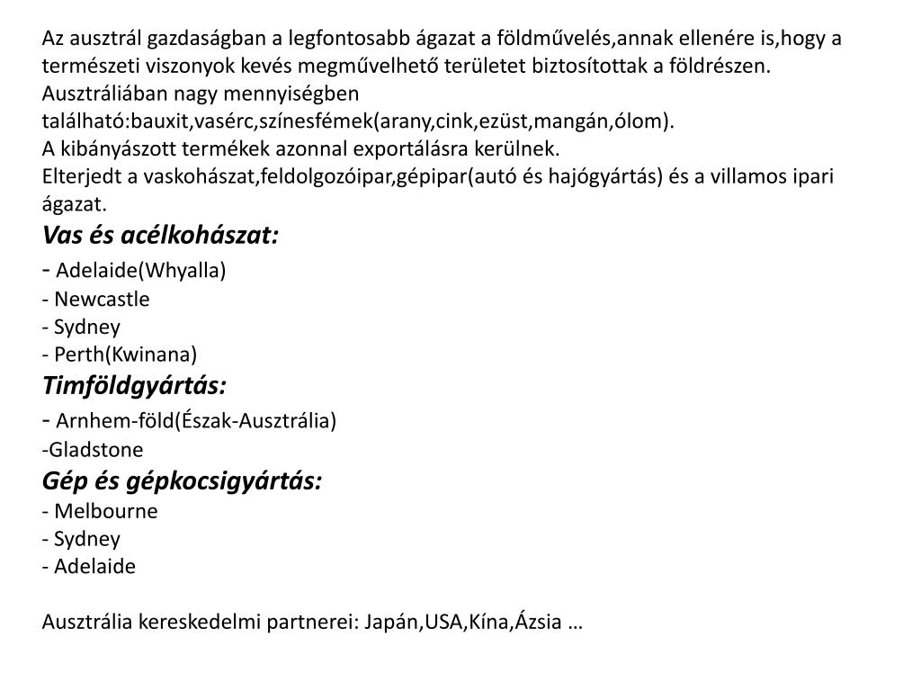 Az ausztrál gazdaságban a legfontosabb ágazat a földművelés,annak ellenére is,hogy a természeti viszonyok kevés megművelhető területet biztosítottak a földrészen.Ausztráliában nagy mennyiségben található:bauxit,vasérc,színesfémek(arany,cink,ezüst,mangán,ólom).A kibányászott termékek azonnal exportálásra kerülnek.Elterjedt a vaskohászat,feldolgozóipar,gépipar(autó és hajógyártás) és a villamos ipari ágazat.Vas és acélkohászat:-Adelaide(Whyalla)- Newcastle - Sydney- Perth(Kwinana)Timföldgyártás:-Arnhem-föld(Észak-Ausztrália)-GladstoneGép és gépkocsigyártás:- Melbourne- Sydney- Adelaide Ausztrália kereskedelmi partnerei: Japán,USA,Kína,Ázsia …