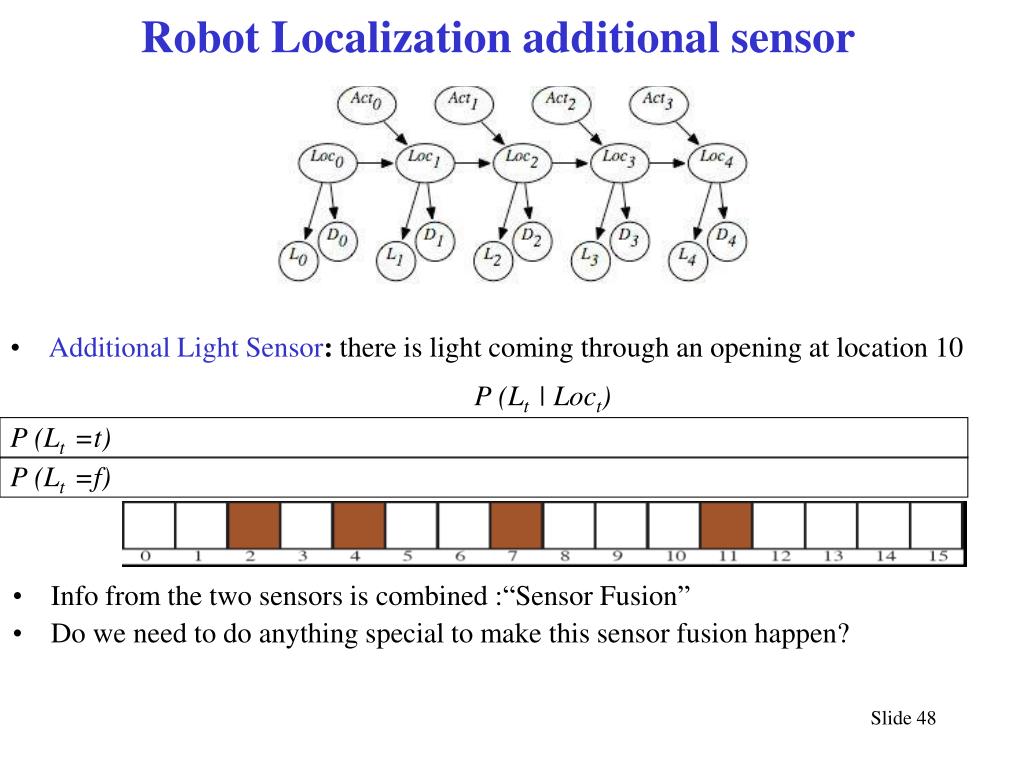 Robot Localization additional sensor • Additional Light Sensor: there is light coming through an opening at location 10 P (Lt | Loct) P (Lt =t) P (Lt =f) • Info from the two sensors is combined :“Sensor Fusion” • Do we need to do anything special to make this sensor fusion happen?