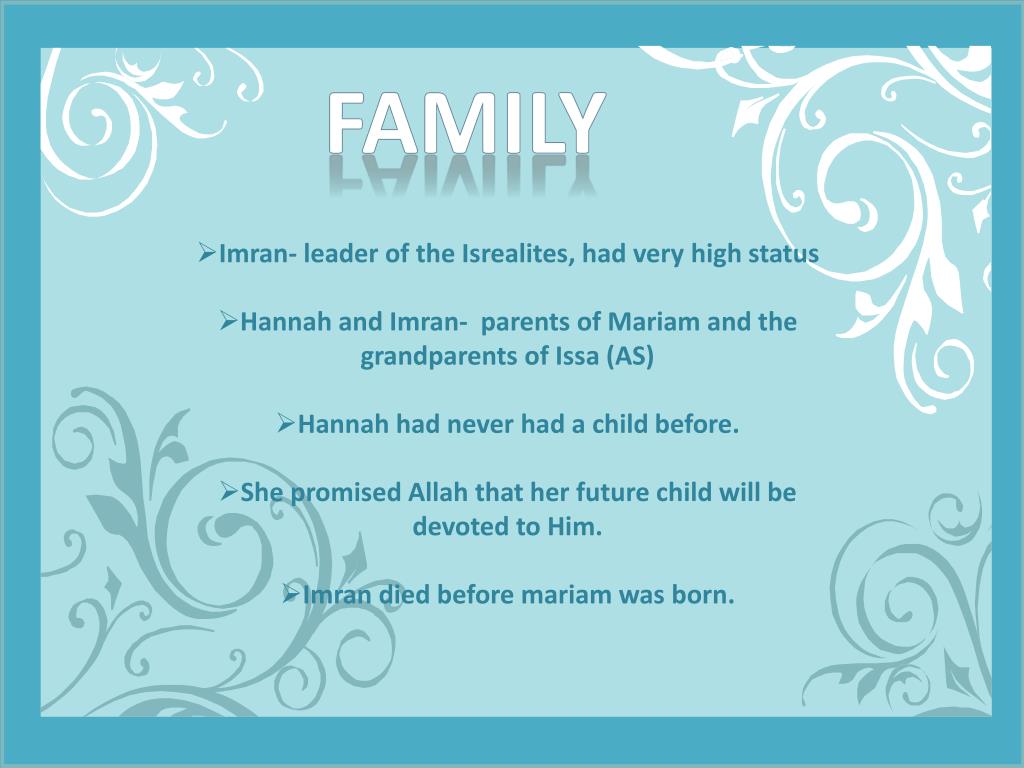 Family • Imran- leader of the Isrealites, had very high status • Hannah and Imran- parents of Mariam and the grandparents of Issa (AS) • Hannah had never had a child before. • She promised Allah that her future child will be devoted to Him. • Imran died before mariam was born.