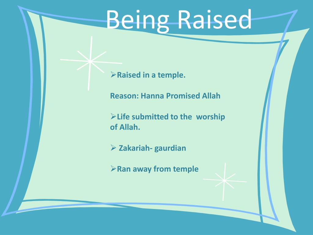 Being Raised • Raised in a temple. • Reason: Hanna Promised Allah • Life submitted to the worship of Allah. • Zakariah- gaurdian • Ran away from temple