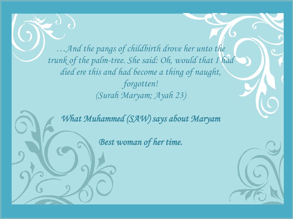…And the pangs of childbirth drove her unto the trunk of the palm-tree. She said: Oh, would that I had died ere this and had become a thing of naught, forgotten! (Surah Maryam; Ayah 23) What Muhammed (SAW) says about Maryam Best woman of her time.