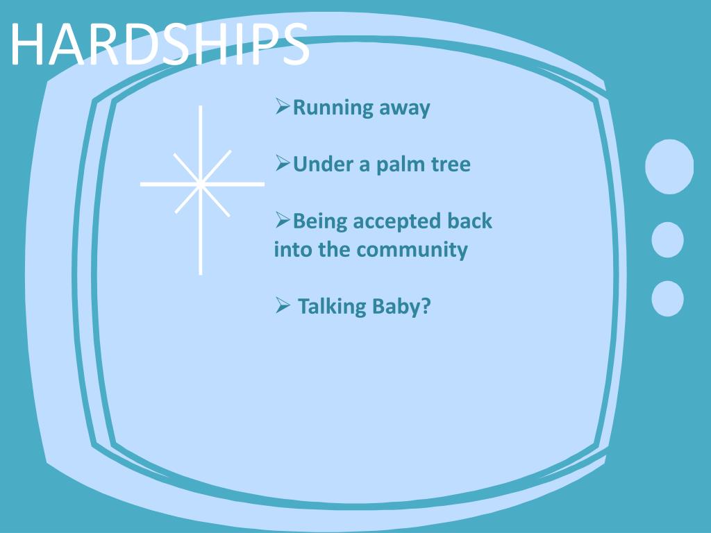 HARDSHIPS • Running away • Under a palm tree • Being accepted back into the community • Talking Baby?