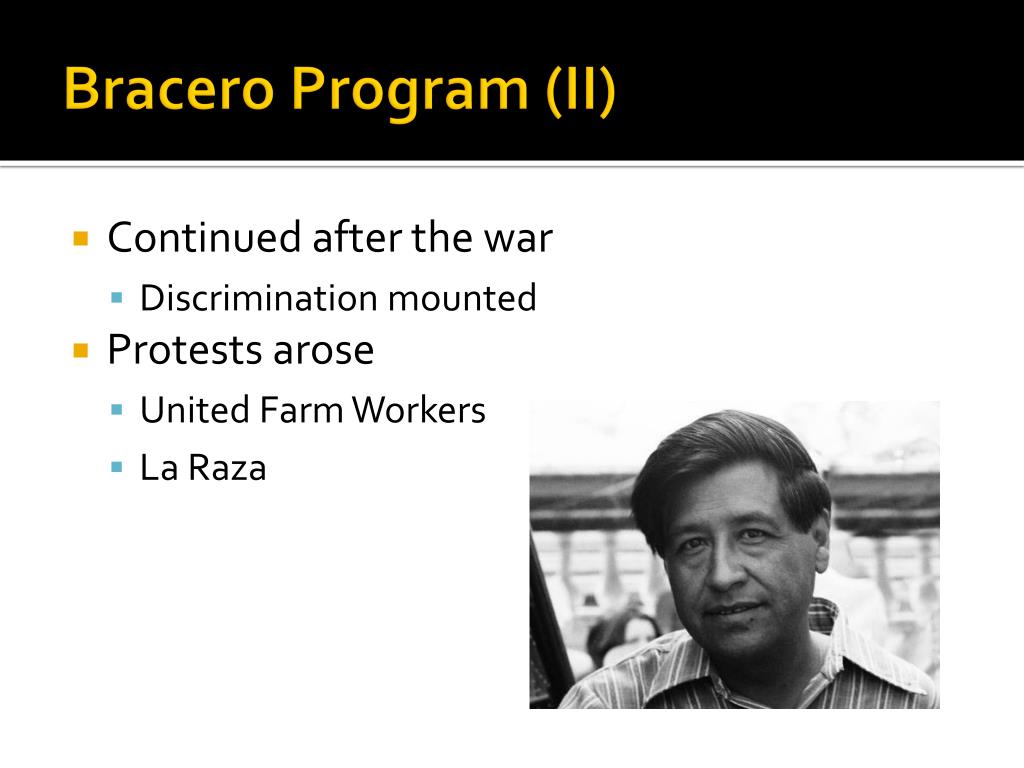 Bracero Program (II) • Continued after the war • Discrimination mounted • Protests arose • United Farm Workers • La Raza