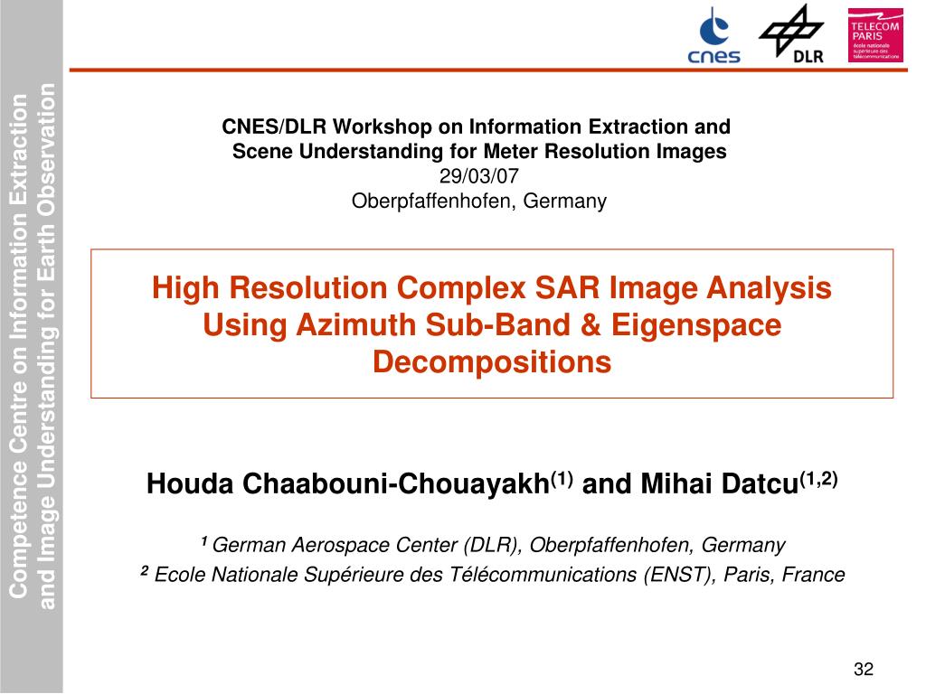 CNES/DLR Workshop on Information Extraction and Scene Understanding for Meter Resolution Images 29/03/07 Oberpfaffenhofen, Germany. High Resolution Complex SAR Image Analysis Using Azimuth Sub-Band & Eigenspace Decompositions . Houda Chaabouni-Chouayakh (1) and Mihai Datcu (1,2)