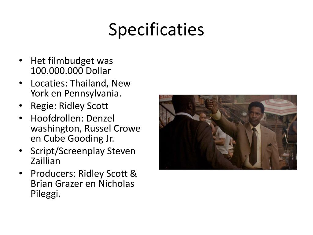 Specificaties • Het filmbudget was 100.000.000 Dollar • Locaties: Thailand, New York en Pennsylvania. • Regie: Ridley Scott • Hoofdrollen: Denzelwashington, Russel Crowe en Cube Gooding Jr. • Script/Screenplay Steven Zaillian • Producers: Ridley Scott & Brian Grazer en Nicholas Pileggi.