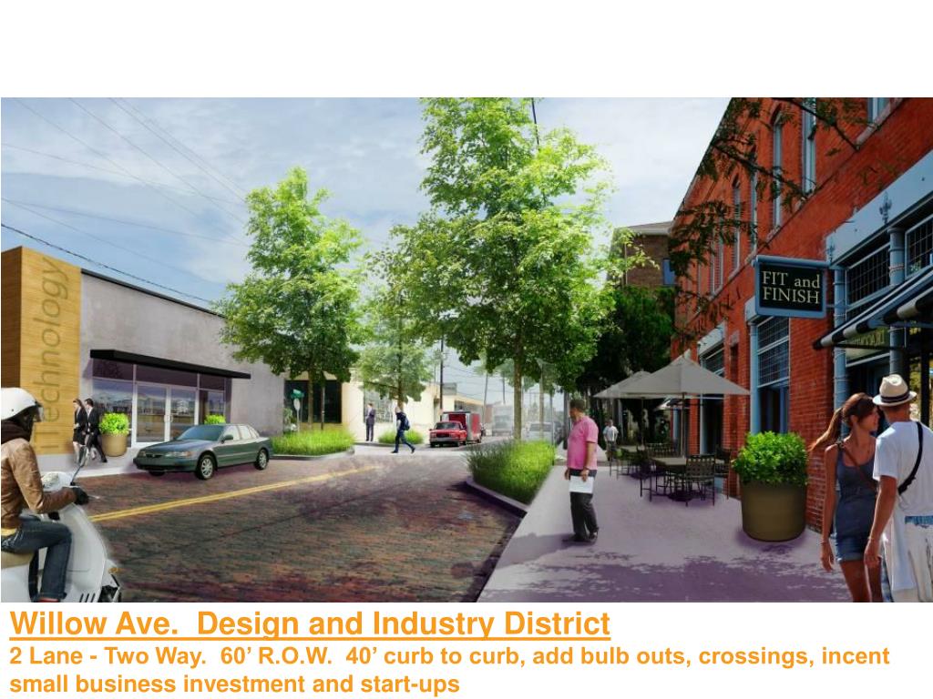 Willow Ave. Design and Industry District 2 Lane - Two Way. 60’ R.O.W. 40’ curb to curb, add bulb outs, crossings, incent small business investment and start-ups