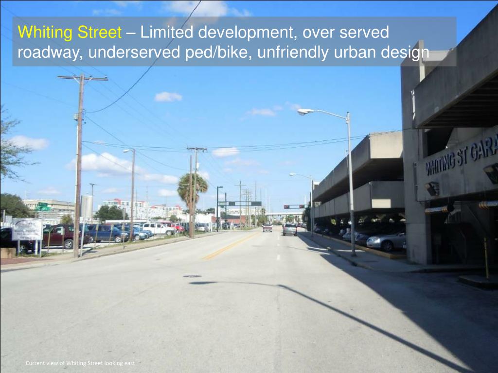 Whiting Street – Limited development, over served roadway, underserved ped/bike, unfriendly urban design Current view of Whiting Street looking east
