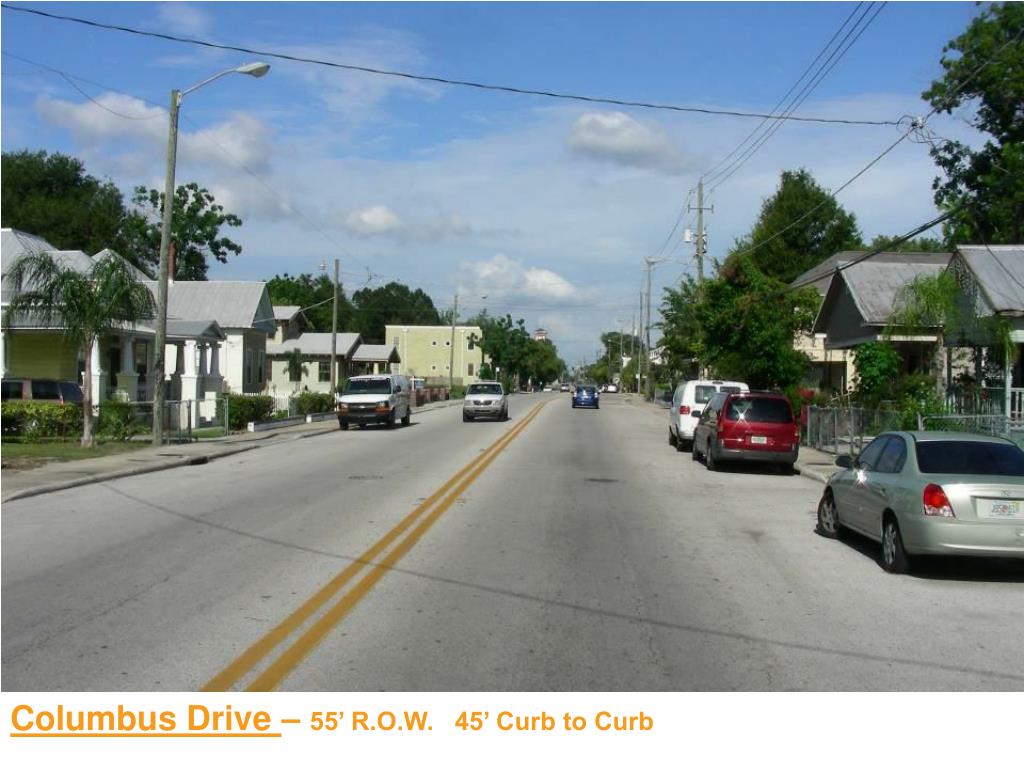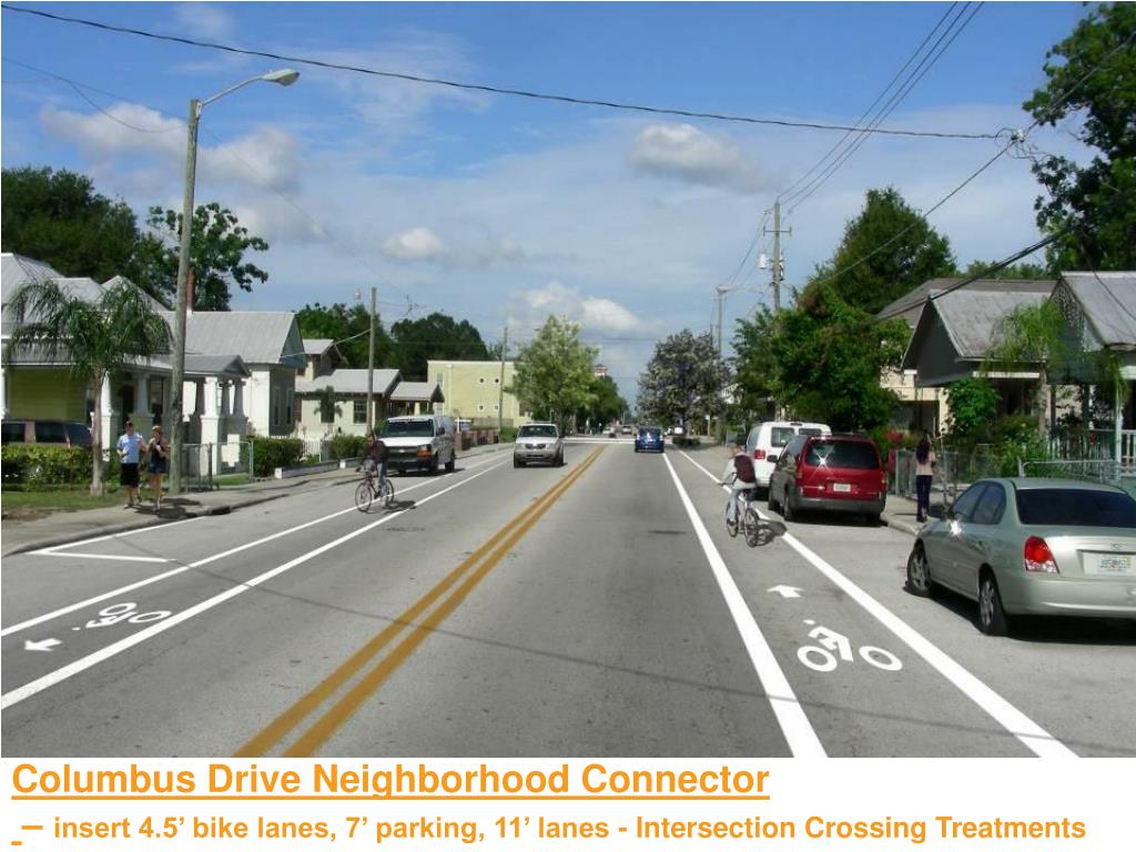Columbus Drive Neighborhood Connector – insert 4.5’ bike lanes, 7’ parking, 11’ lanes - Intersection Crossing Treatments