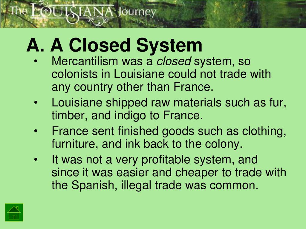 A. A Closed System • Mercantilism was a closed system, so colonists in Louisiane could not trade with any country other than France. • Louisiane shipped raw materials such as fur, timber, and indigo to France. • France sent finished goods such as clothing, furniture, and ink back to the colony. • It was not a very profitable system, and since it was easier and cheaper to trade with the Spanish, illegal trade was common.