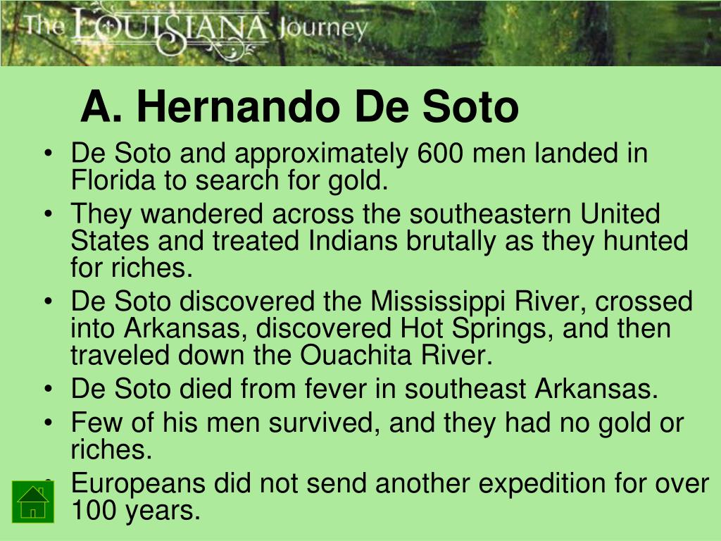 A. Hernando De Soto • De Soto and approximately 600 men landed in Florida to search for gold. • They wandered across the southeastern United States and treated Indians brutally as they hunted for riches. • De Soto discovered the Mississippi River, crossed into Arkansas, discovered Hot Springs, and then traveled down the Ouachita River. • De Soto died from fever in southeast Arkansas. • Few of his men survived, and they had no gold or riches. • Europeans did not send another expedition for over 100 years.