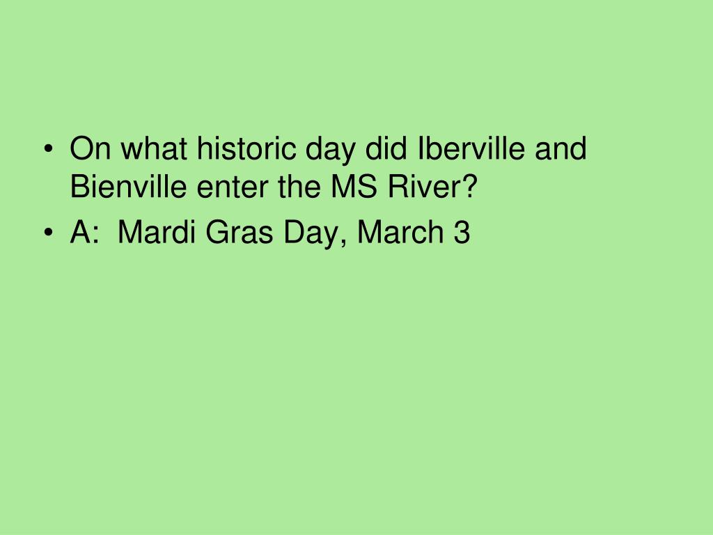 On what historic day did Iberville and Bienville enter the MS River? • A: Mardi Gras Day, March 3