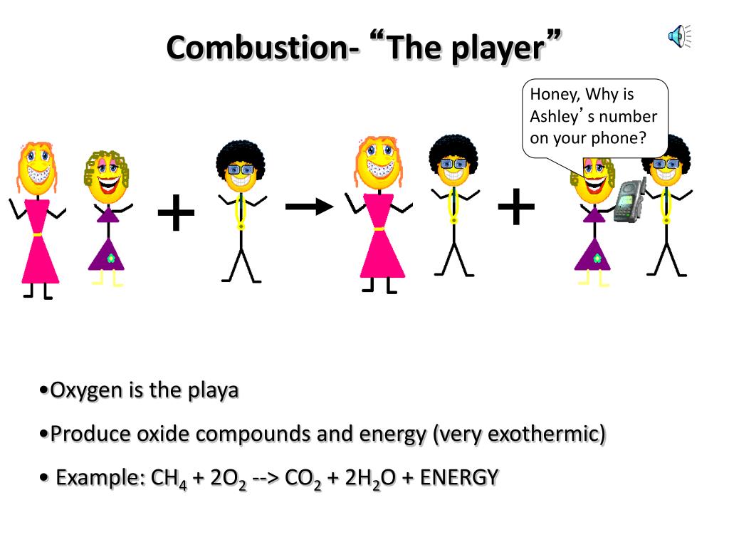 Combustion- “The playa” That was a great date! Who’s that HOTTIE? Ashley you’re my BFF!! Hey Ladies!! How you doin? Baby, I love you! (3 weeks later) BLING! Basic Equation: AB + O --> AO + BO