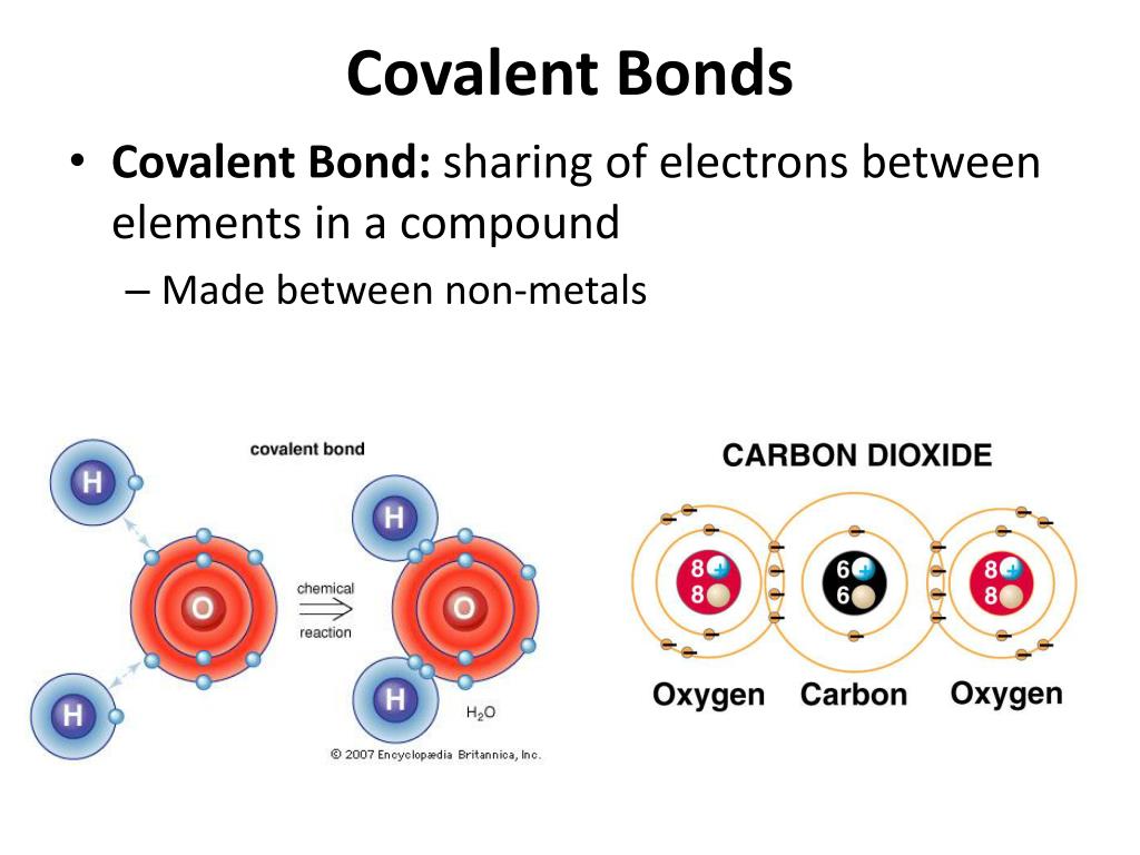 Covalent Bonds • Covalent Bond: sharing of electrons between elements in a compound • Made between non-metals