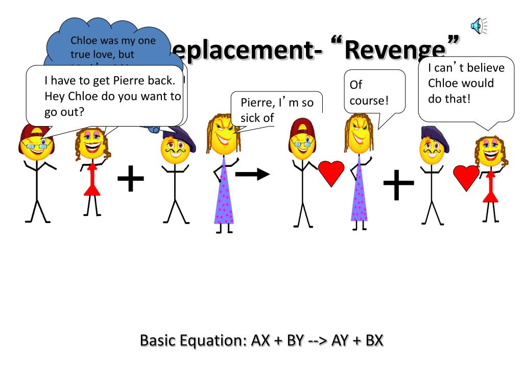 Double Replacement- “Revenge” Chloe was my one true love, but Mark’s girl is looking pretty HOTT! I can’t believe Chloe would do that! I have to get Pierre back. Hey Chloe do you want to go out? But Chloe I love you, I can’t live with out you!!! Of course! Hey Baby Pierre, I’m so sick of you! Oh Pierre! Basic Equation: AX + BY --> AY + BX