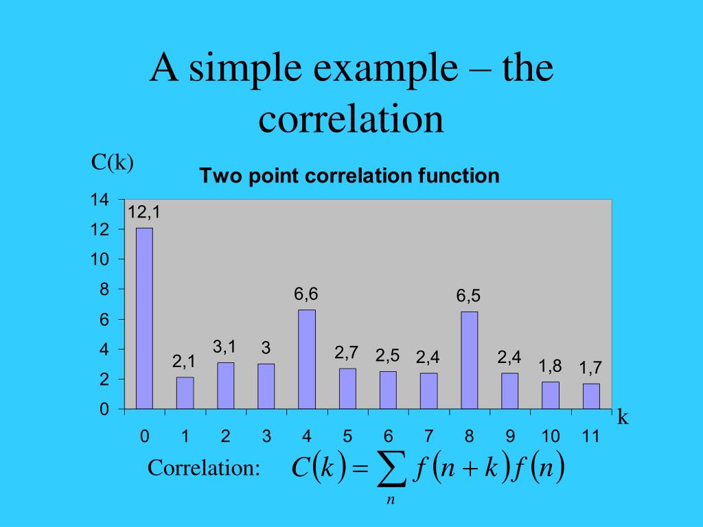 Correlation functions • Correlation functions give us information on the structures existing in the spectrum of our data or given mathematical function • Two point correlation function of f(x):