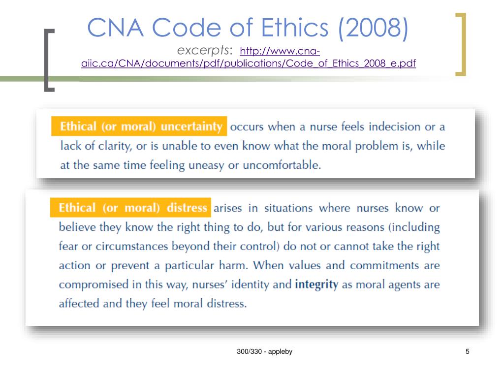 CNA Code of Ethics (2008) excerpts: http://www.cna-aiic.ca/CNA/documents/pdf/publications/Code_of_Ethics_2008_e.pdf 300/330 - appleby