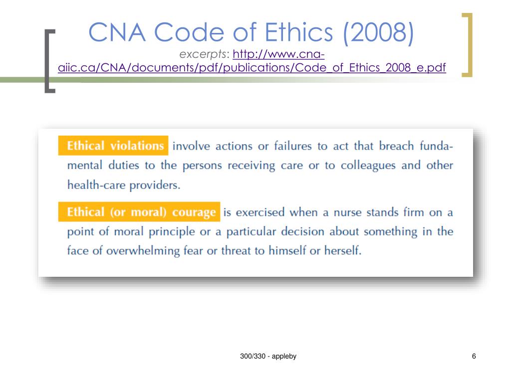 CNA Code of Ethics (2008)excerpts: http://www.cna-aiic.ca/CNA/documents/pdf/publications/Code_of_Ethics_2008_e.pdf 300/330 - appleby