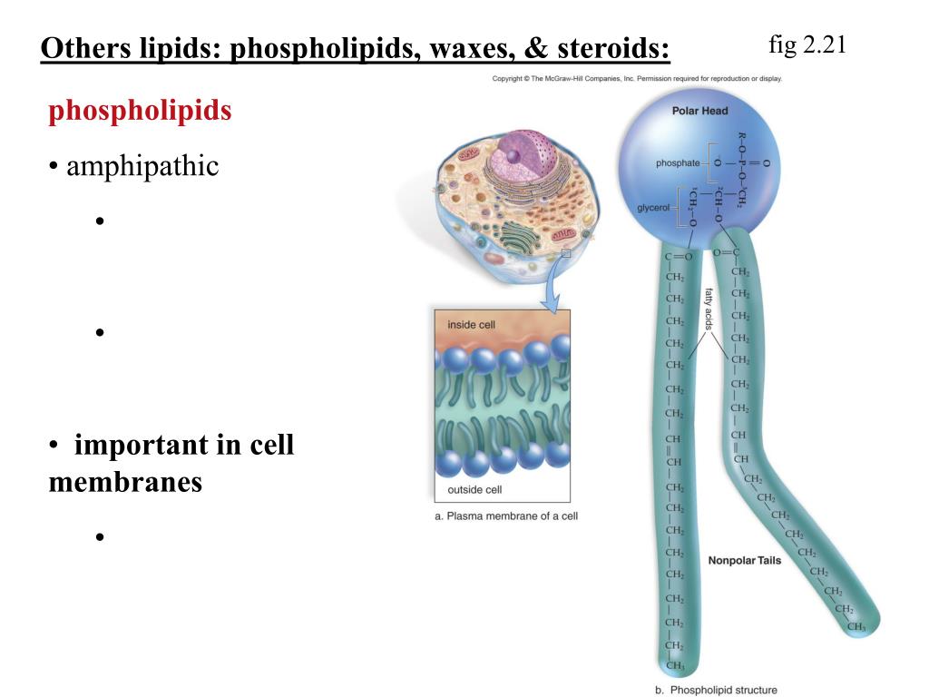 Others lipids: phospholipids, waxes, & steroids: fig 2.21 • phospholipids • amphipathic • important in cell membranes