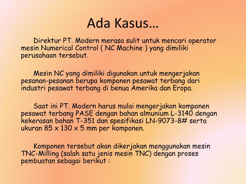 Ada Kasus… Direktur PT. Modern merasasulituntukmencari operator mesin Numerical Control ( NC Machine ) yang dimilikiperusahaantersebut. Mesin NC yang dimilikidigunakanuntukmengerjakanpesanan-pesananberupakomponenpesawatterbangdariindustripesawatterbangdibenuaAmerikadanEropa. Saatini PT. Modern harusmulaimengerjakankomponenpesawatterbang PASE denganbahanalmunium L-3140 dengankekerasanbahan T-351 danspesifikasi LN-9073-8# sertaukuran 85 x 130 x 5 mm per komponen. Komponentersebutakandikerjakanmenggunakanmesin TNC-Milling (salahsatujenismesin TNC) denganprosespembuatansebagaiberikut :