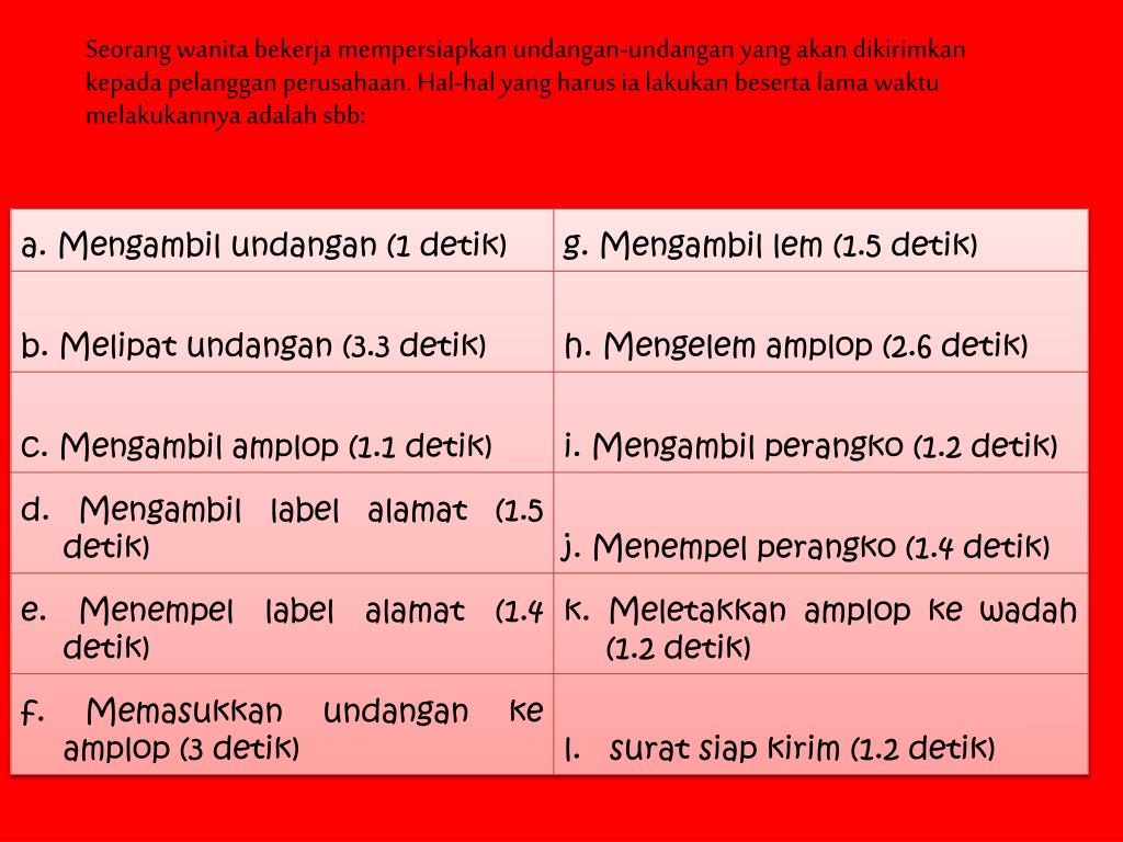 Seorang wanita bekerja mempersiapkan undangan-undangan yang akan dikirimkan kepada pelanggan perusahaan. Hal-hal yang harus ia lakukan beserta lama waktu melakukannya adalah sbb: