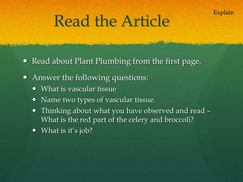 Read the Article Explain • Read about Plant Plumbing from the first page. • Answer the following questions: • What is vascular tissue • Name two types of vascular tissue. • Thinking about what you have observed and read – What is the red part of the celery and broccoli? • What is it’s job?