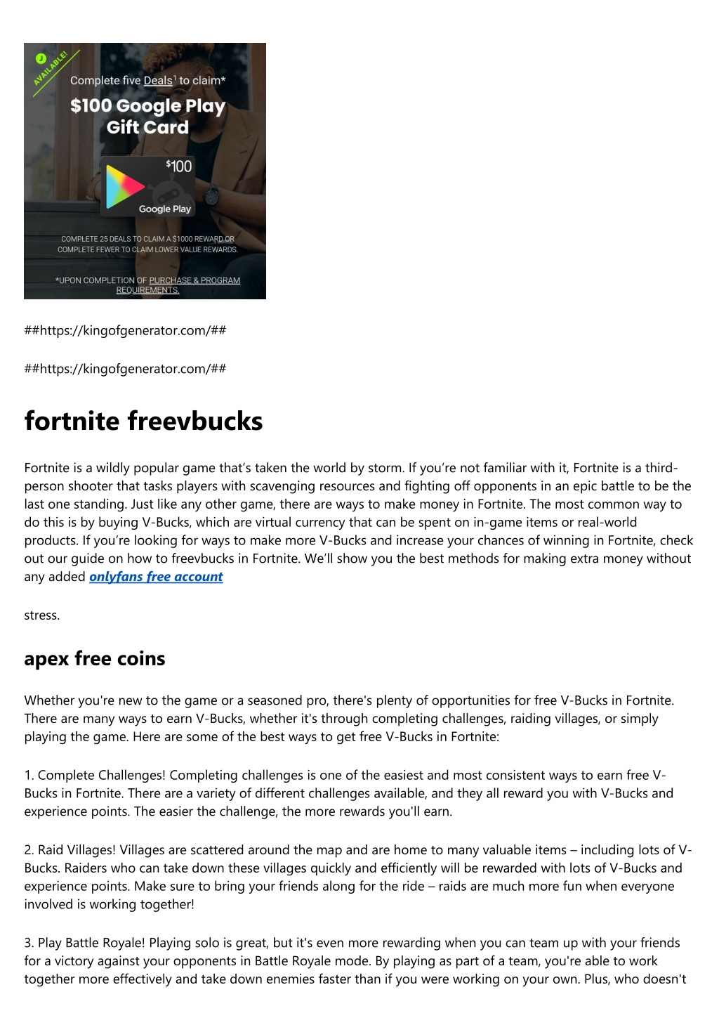 ##https://kingofgenerator.com/## ##https://kingofgenerator.com/## fortnite freevbucks Fortnite is a wildly popular game that’s taken the world by storm. If you’re not familiar with it, Fortnite is a third- person shooter that tasks players with scavenging resources and fighting off opponents in an epic battle to be the last one standing. Just like any other game, there are ways to make money in Fortnite. The most common way to do this is by buying V-Bucks, which are virtual currency that can be spent on in-game items or real-world products. If you’re looking for ways to make more V-Bucks and increase your chances of winning in Fortnite, check out our guide on how to freevbucks in Fortnite. We’ll show you the best methods for making extra money without any added onlyfans free account stress. apex free coins Whether you're new to the game or a seasoned pro, there's plenty of opportunities for free V-Bucks in Fortnite. There are many ways to earn V-Bucks, whether it's through completing challenges, raiding villages, or simply playing the game. Here are some of the best ways to get free V-Bucks in Fortnite: 1. Complete Challenges! Completing challenges is one of the easiest and most consistent ways to earn free V- Bucks in Fortnite. There are a variety of different challenges available, and they all reward you with V-Bucks and experience points. The easier the challenge, the more rewards you'll earn. 2. Raid Villages! Villages are scattered around the map and are home to many valuable items – including lots of V- Bucks. Raiders who can take down these villages quickly and efficiently will be rewarded with lots of V-Bucks and experience points. Make sure to bring your friends along for the ride – raids are much more fun when everyone involved is working together! 3. Play Battle Royale! Playing solo is great, but it's even more rewarding when you can team up with your friends for a victory against your opponents in Battle Royale mode. By playing as part of a team, you're able to work together more effectively and take down enemies faster than if you were working on your own. Plus, who doesn't