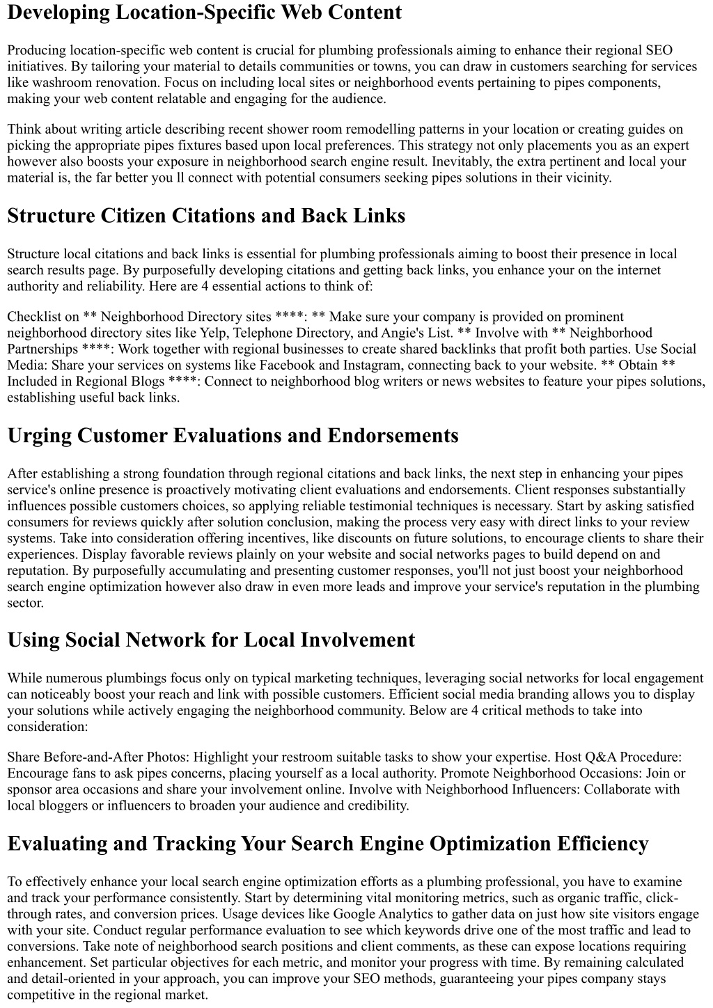 Developing Location-Specific Web Content Producing location-specific web content is crucial for plumbing professionals aiming to enhance their regional SEO initiatives. By tailoring your material to details communities or towns, you can draw in customers searching for services like washroom renovation. Focus on including local sites or neighborhood events pertaining to pipes components, making your web content relatable and engaging for the audience. Think about writing article describing recent shower room remodelling patterns in your location or creating guides on picking the appropriate pipes fixtures based upon local preferences. This strategy not only placements you as an expert however also boosts your exposure in neighborhood search engine result. Inevitably, the extra pertinent and local your material is, the far better you ll connect with potential consumers seeking pipes solutions in their vicinity. Structure Citizen Citations and Back Links Structure local citations and back links is essential for plumbing professionals aiming to boost their presence in local search results page. By purposefully developing citations and getting back links, you enhance your on the internet authority and reliability. Here are 4 essential actions to think of: Checklist on ** Neighborhood Directory sites ****: ** Make sure your company is provided on prominent neighborhood directory sites like Yelp, Telephone Directory, and Angie's List. ** Involve with ** Neighborhood Partnerships ****: Work together with regional businesses to create shared backlinks that profit both parties. Use Social Media: Share your services on systems like Facebook and Instagram, connecting back to your website. ** Obtain ** Included in Regional Blogs ****: Connect to neighborhood blog writers or news websites to feature your pipes solutions, establishing useful back links. Urging Customer Evaluations and Endorsements After establishing a strong foundation through regional citations and back links, the next step in enhancing your pipes service's online presence is proactively motivating client evaluations and endorsements. Client responses substantially influences possible customers choices, so applying reliable testimonial techniques is necessary. Start by asking satisfied consumers for reviews quickly after solution conclusion, making the process very easy with direct links to your review systems. Take into consideration offering incentives, like discounts on future solutions, to encourage clients to share their experiences. Display favorable reviews plainly on your website and social networks pages to build depend on and reputation. By purposefully accumulating and presenting customer responses, you'll not just boost your neighborhood search engine optimization however also draw in even more leads and improve your service's reputation in the plumbing sector. Using Social Network for Local Involvement While numerous plumbings focus only on typical marketing techniques, leveraging social networks for local engagement can noticeably boost your reach and link with possible customers. Efficient social media branding allows you to display your solutions while actively engaging the neighborhood community. Below are 4 critical methods to take into consideration: Share Before-and-After Photos: Highlight your restroom suitable tasks to show your expertise. Host Q&A Procedure: Encourage fans to ask pipes concerns, placing yourself as a local authority. Promote Neighborhood Occasions: Join or sponsor area occasions and share your involvement online. Involve with Neighborhood Influencers: Collaborate with local bloggers or influencers to broaden your audience and credibility. Evaluating and Tracking Your Search Engine Optimization Efficiency To effectively enhance your local search engine optimization efforts as a plumbing professional, you have to examine and track your performance consistently. Start by determining vital monitoring metrics, such as organic traffic, click- through rates, and conversion prices. Usage devices like Google Analytics to gather data on just how site visitors engage with your site. Conduct regular performance evaluation to see which keywords drive one of the most traffic and lead to conversions. Take note of neighborhood search positions and client comments, as these can expose locations requiring enhancement. Set particular objectives for each metric, and monitor your progress with time. By remaining calculated and detail-oriented in your approach, you can improve your SEO methods, guaranteeing your pipes company stays competitive in the regional market.